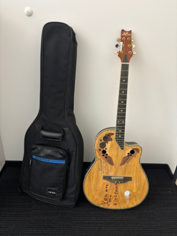 braune E-Gitarre aus Holz mit Schriftzug, schwarze Gitarrentasche der Marke Gewa