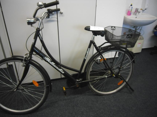 Bemerkung: schwarzer Korb auf Gepäckträger, Beleuchtung hinten defekt, Beleuchtung vorn Kabel defekt, großer Fahrradständer am Hinterrad, Korb und Rad Roststellen, Klingel vorhanden