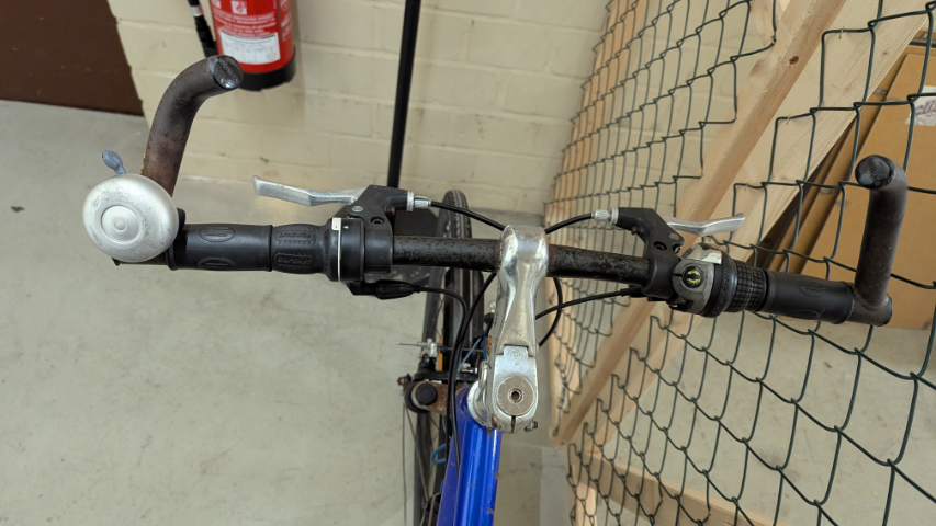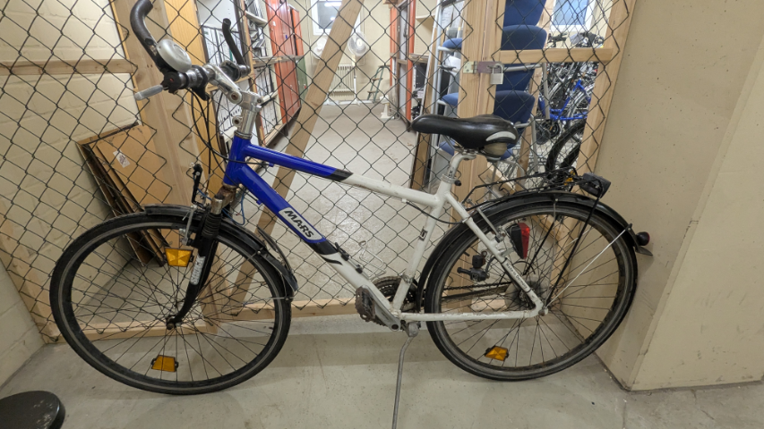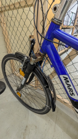Herrenrad von Mars in blau/weiß7schwarz, Beleutung vorne und Schutzblech vorderer Reifen beschädigt.